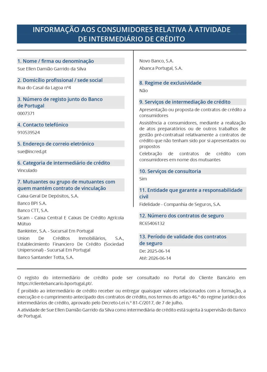 Todas as informações podem também ser consultadas em em https://www.bportugal.pt/intermediariocreditofar/sue-ellen-damiao-garrido-da-silva
